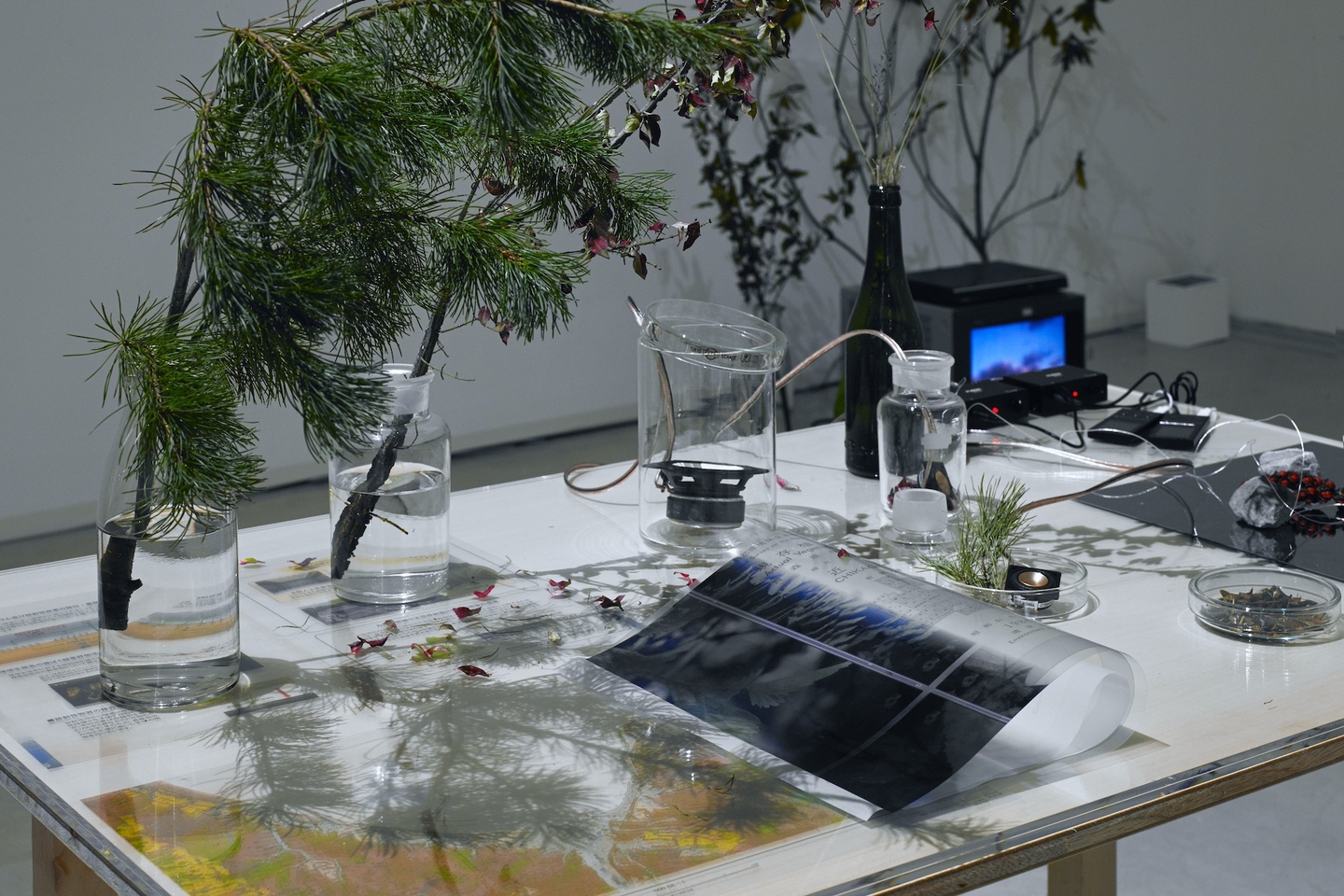 Video, sound, radio, aroma of Abies mariesii, plants, bottles, paper, OHP, specially prepared tea with kawara-ketsumei